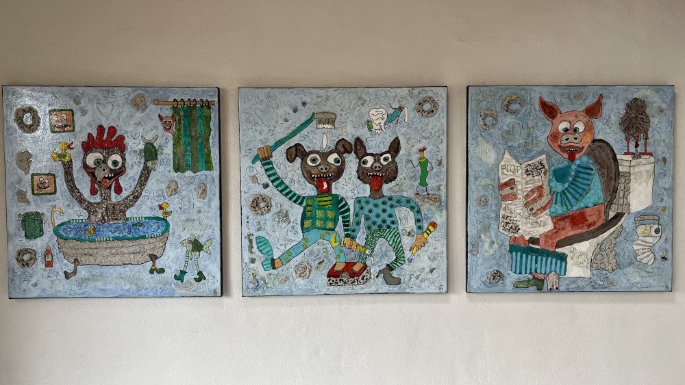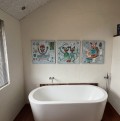 Glad i bad + Tandpastasmil + Plop i kummen SOLGT 3 solgte Galleri-HJ malerier str. 60x60 i kundens dejlige hjem. Mange tak for fotografiet. Smil og glæde fra Helle, www.Galleri-HJ.dk